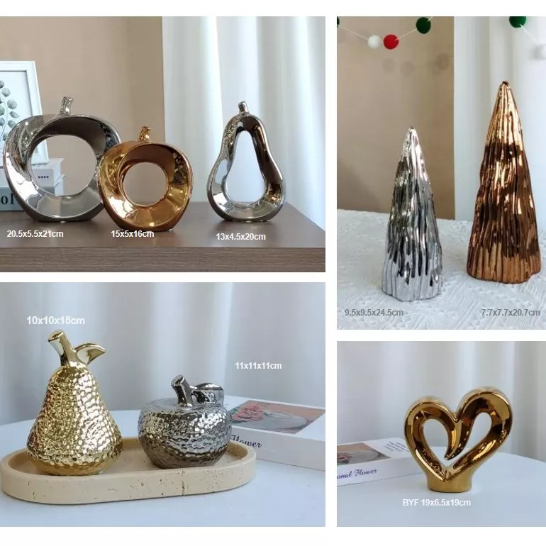 I decori ceramici speciali di BYF presentano frutta, alberi di Natale e cuori. Realizzati in ceramica, utilizzano una tecnica unica per creare una lucentezza metallica, disponibile in oro e argento. I disegni di frutta (mela e pera) presentano linee lisce, con ritagli e trame unici; L'albero di Natale è tridimensionale, con trame ricche; E il cuore è semplice ed elegante, dando un tocco di romanticismo. Questi pezzi eleganti e luci leggeri sono perfetti per il tuo salotto o tavolo, aggiungendo un tocco di talento artistico e stile a casa tua. Sono accessori raffinati che migliorano l'atmosfera di qualsiasi spazio.